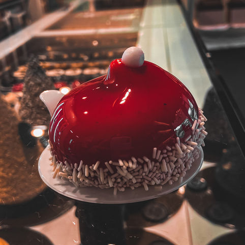Cappellino monoporzione realizzato con una base al biscotto, una mousse di cioccolato bianco, all’interno troviamo un cuore di lampone, il tutto ricoperto da una glassa ai lamponi