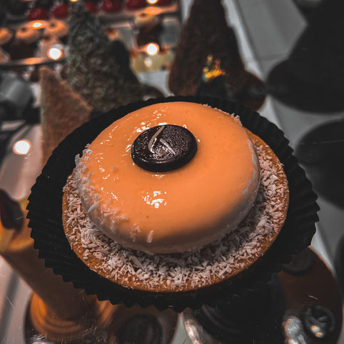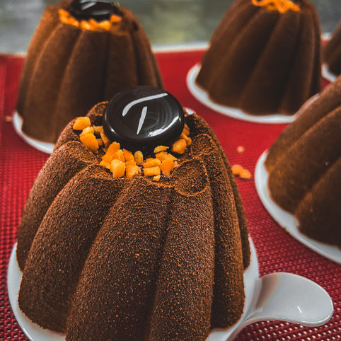 Monoporzione realizzata con una mousse di cioccolato fondente con cuore di arancia fresca e glassata fondente. Il tutto appoggiato su un biscotto finissimo granellato di cioccolato fondente finemente spruzzato d'oro.